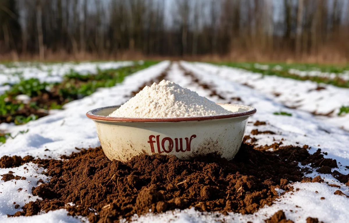 Представьте мартовское солнце. Снежная корка подтаивает, появляется первый влажный наст. Вот по этой влажной поверхности и нужно равномерно рассыпать ту самую «муку». Весь смысл в том, что талая вода — лучший проводник. Она медленно, сантиметр за сантиметром, затягивает частички муки в почву. Удобрение распределяется максимально равномерно, без риска обжечь корни будущих растений. Это естественная, медленная подкормка, которую проводит сама природа. Весной вам останется только взять в руки грабли и поразиться, какой мягкой и готовой к посадкам стала земля.
