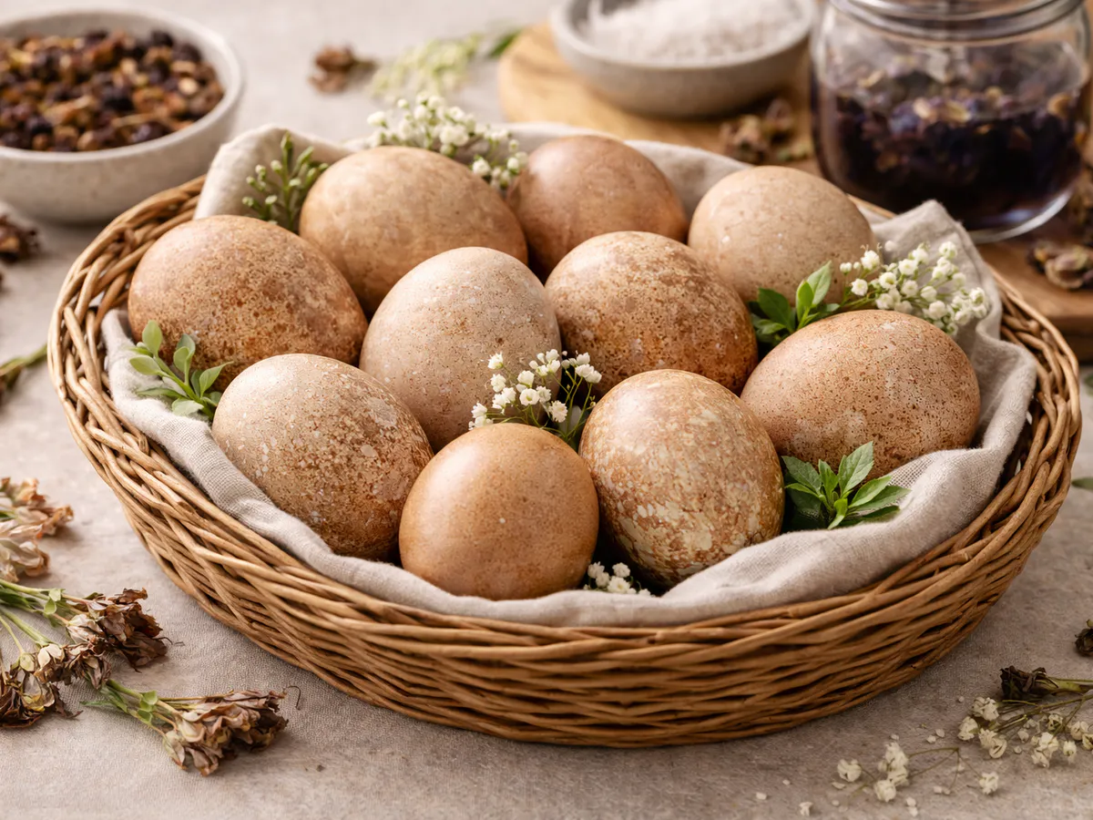 После этого яйца опускают в тёмный раствор и оставляют примерно на полчаса. За это время скорлупа постепенно приобретает мягкий коричневый оттенок. Если хочется цвет глубже, яйца можно подержать в растворе чуть дольше.