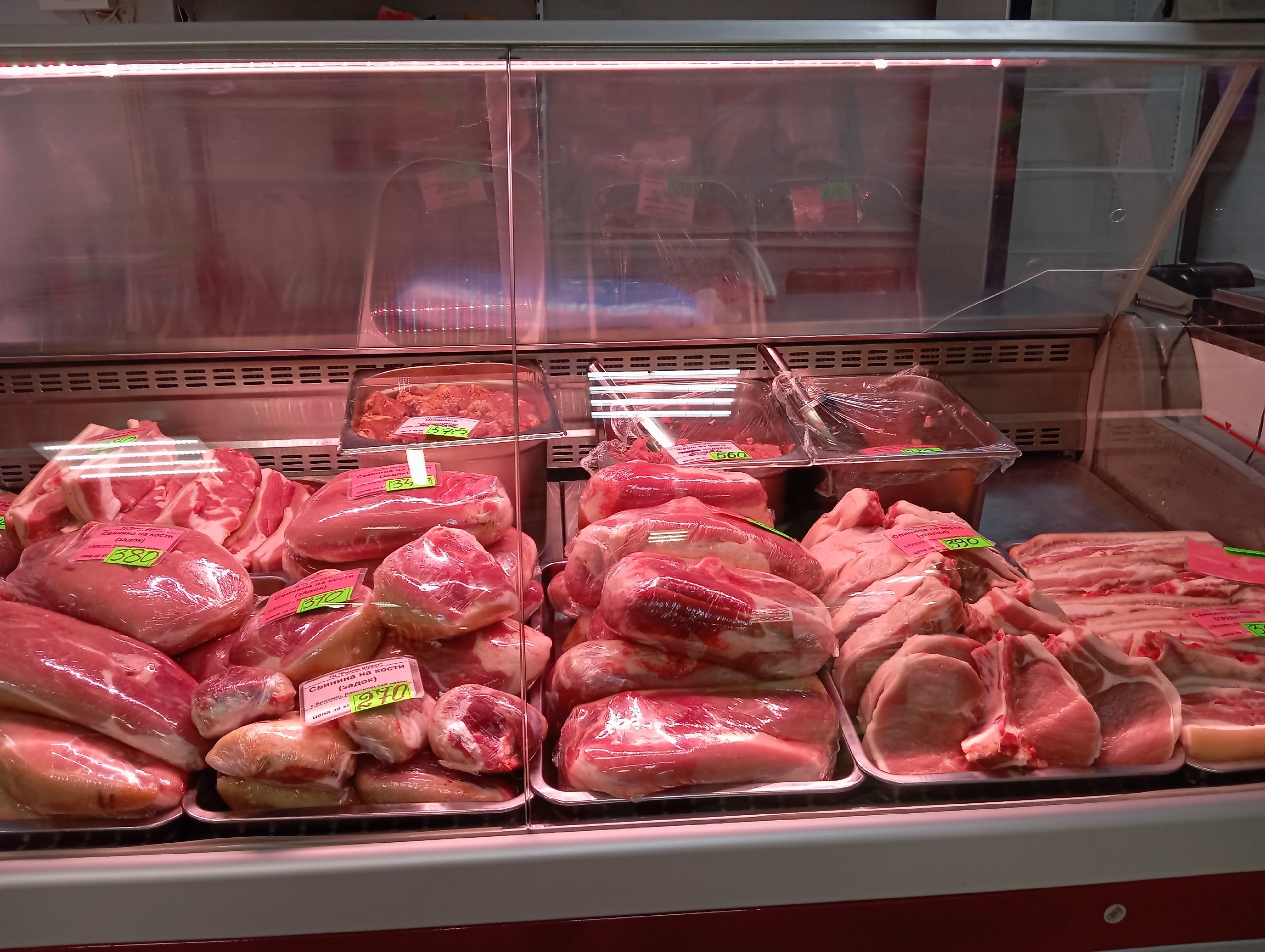 Мясной отдел в «Светофоре» — место для людей с крепкими нервами. Холодильники часто завешены бледно-розовыми полосами, напоминающими резину. Запах — специфический, на грани между старым холодильником и сыростью. Классическая проверка свежести работает безотказно: нажимаешь на поверхность пальцем — вмятина не исчезает. Это говорит о том, что продукт явно не первой свежести.