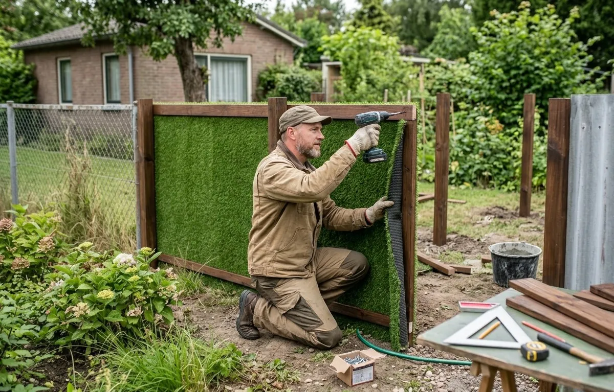 Тем, кто не хочет ждать, подойдут рулоны с искусственными вьющимися растениями или хвоей. Их просто крепят на сетку, и забор сразу становится непрозрачным.