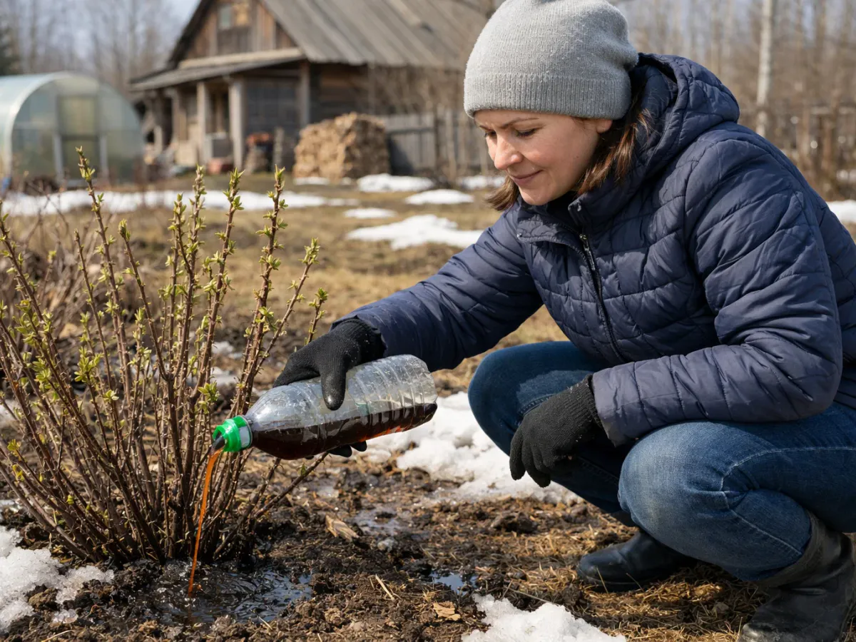 Если осенью не вносили, делают это ранней весной. На взрослый куст: 20–30 г сульфата калия и 25–30 г двойного суперфосфата (или 50–60 г простого). Удобрения заделывают в борозду по проекции кроны.