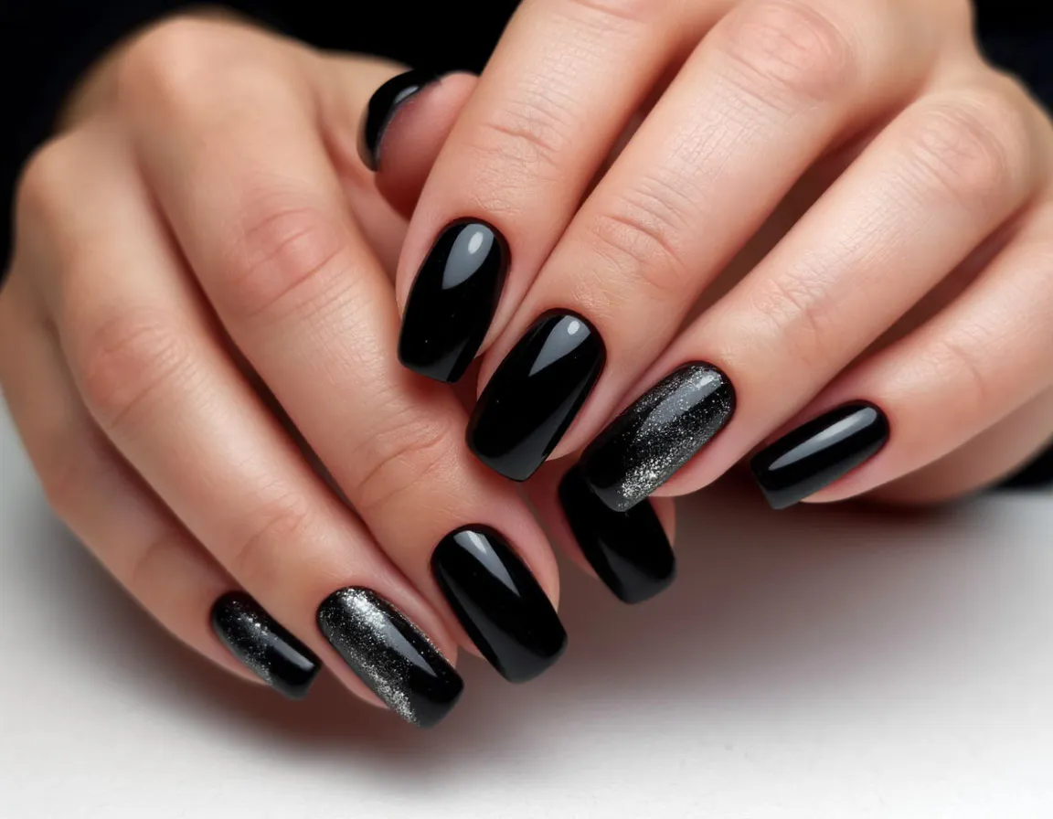 Когда-то чёрные ногти считались дерзостью, но сегодня это скорее про уверенность. Глубокий угольный оттенок с глянцем выглядит спокойно и дорого — без лишнего эпатажа. Особенно красиво он раскрывается на миндалевидной форме: пальцы кажутся тоньше, жесты — мягче.