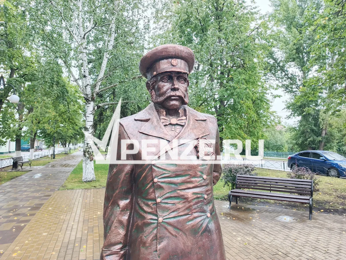 А все потому, что первоначально, по задумке авторов (супругов Бехтеревых), планировалось создать глиняную фигуру. Прообразом решили взять колоритную фигуру таможенника Верещагина из кинофильма «Белое солнце пустыни». Но по моде XIX века ему сделали бакенбарды. Костюм и фонарь, тоже того времени, нашли на исторических картинках. А уже потом родился образ этой скульптурной композиции.