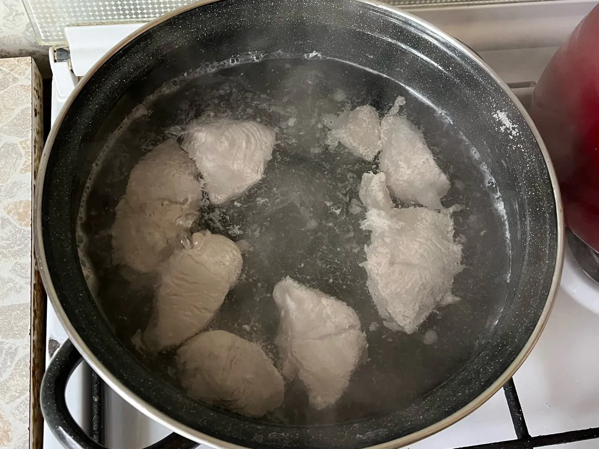 Берём кусок свинины — лопатка, шея, что есть. Килограмма два. Варим до готовности в ароматном бульоне с луком, лаврушкой, перцем. Не жалеем времени, пусть станет совсем мягким. Пока мясо остывает, завариваем крепкий чёрный чай — грамм 500 кипятка на два пакетика. Он даст не вкус, а красивый цвет и лёгкую танинную терпкость. Основа для маринада готова.