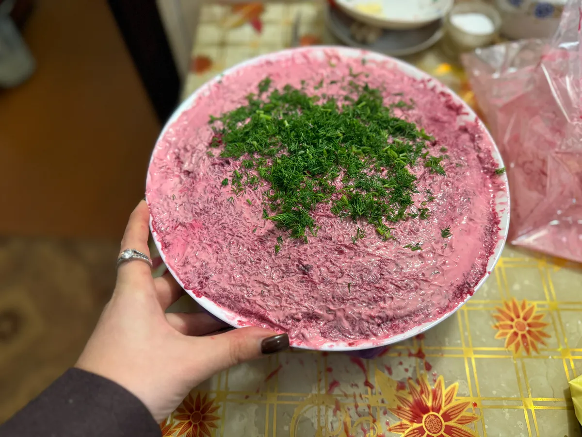 Эстетика. Классическая подача — когда сверху алая свёкла, а не кусочки рыбы. Это красиво, празднично и соответствует названию: шуба сверху, а то, что под ней, — сюрприз, пишет источник.