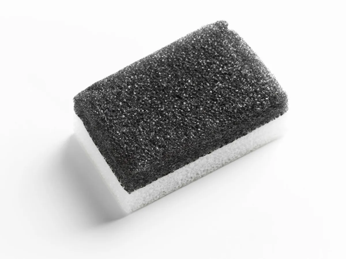 Секрет в том, что она работает только с водой. Никакой химии. Губку нужно хорошенько смочить, отжать до состояния влажной, и можно начинать. А вот руки лучше защитить перчатками — не из-за страшной химии, а потому что меламин — материал довольно жёсткий, и при долгой работе можно стереть кожу на пальцах. Работает просто: трёшь загрязнение, губка немного стирается, а вместе с ней исчезает пятно.