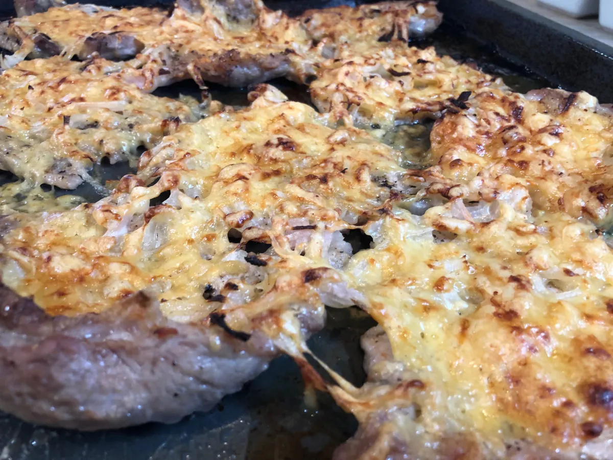 Дальше — всё как в конструкторе. Отбивные, обваленные в муке, выкладывают на противень. На каждую — кружок помидора, щепотку пассерованного лука, горсть грибов и, наконец, шапку картофельного пюре. Финальный штрих — обильное посыпание тёртым сыром. Он расплавится и создаст хрустящую корочку. Сверху можно смазать сметаной или майонезом для золотистости. Дальше духовка, разогретая до 190 градусов, сделает всё сама минут за 30–40. Аромат по квартире будет стоять умопомрачительный.