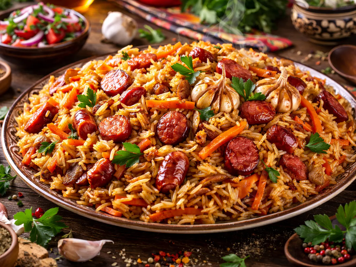 Иногда плов хочется прямо сейчас. Без долгих подготовок, без килограмма мяса, без многочасового томления. И вот тут на кухне вдруг оказывается пачка копчёных колбасок. Кажется, что это совсем не про восточную классику. А потом пробуешь — и понимаешь, что эксперимент удался.
