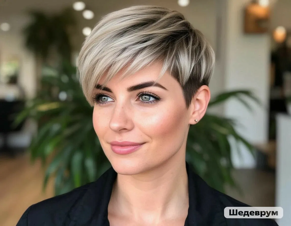 Пикси давно не выглядит радикально. Наоборот, в ней появилось много мягкости. Особенно эффектно смотрится вариант с длинной прямой чёлкой и аккуратно укороченными висками — лицо словно открывается, а у корней появляется тот самый объём, которого часто не хватает.