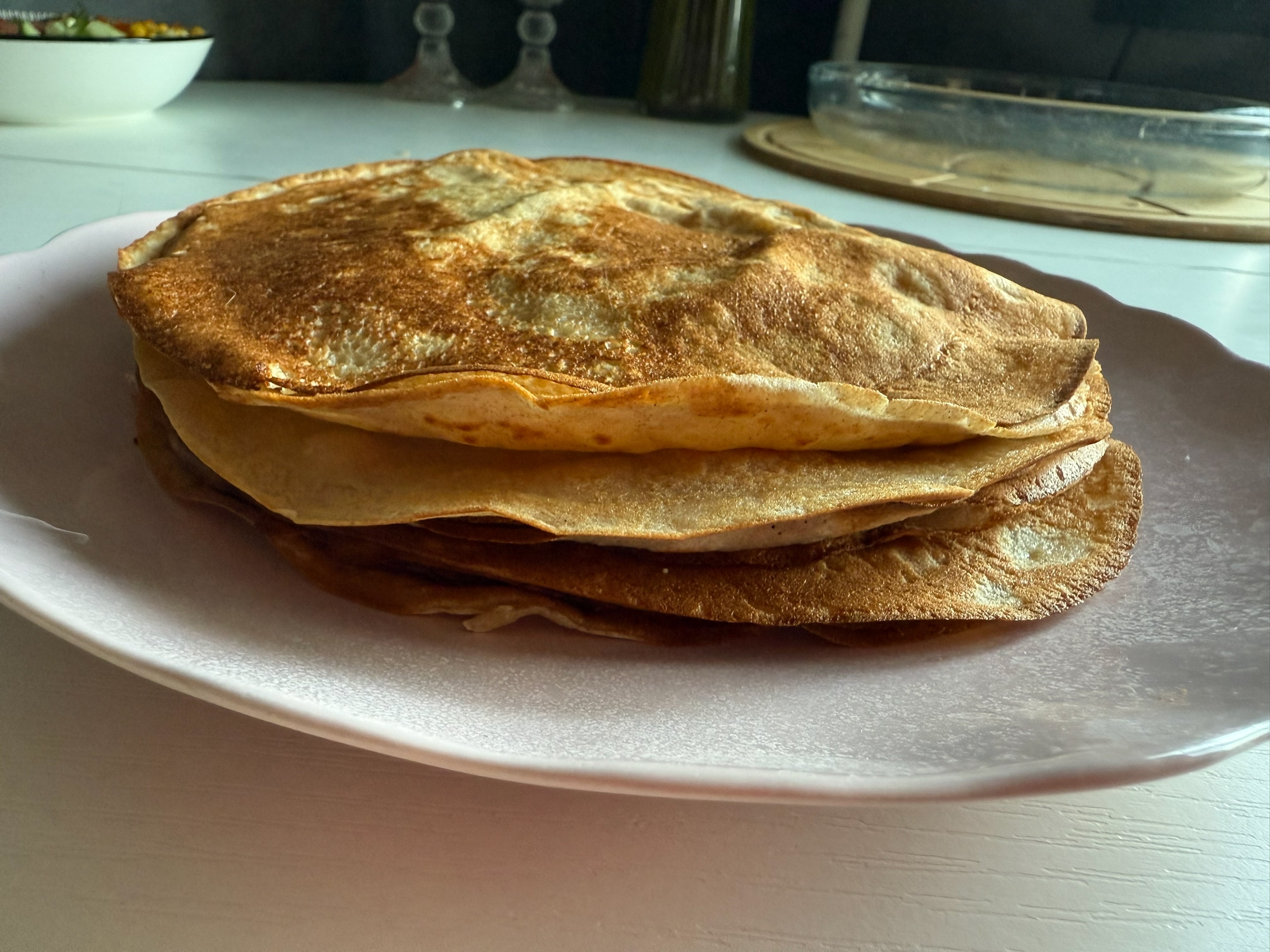 Правильная сковорода — с толстым дном, хорошо разогретая. Тесто перед каждым блином обязательно перемешивайте, так как крахмал имеет свойство оседать. Наливаем порцию, быстро распределяем по дну и жарим на огне выше среднего примерно 30 секунд с одной стороны. Переворачиваем – и всего 10 секунд с другой. Готово!