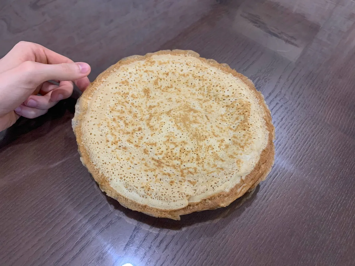 Готовые блины лучше складывать стопкой и накрывать сверху тарелкой — так они сохраняют тепло и нежность.