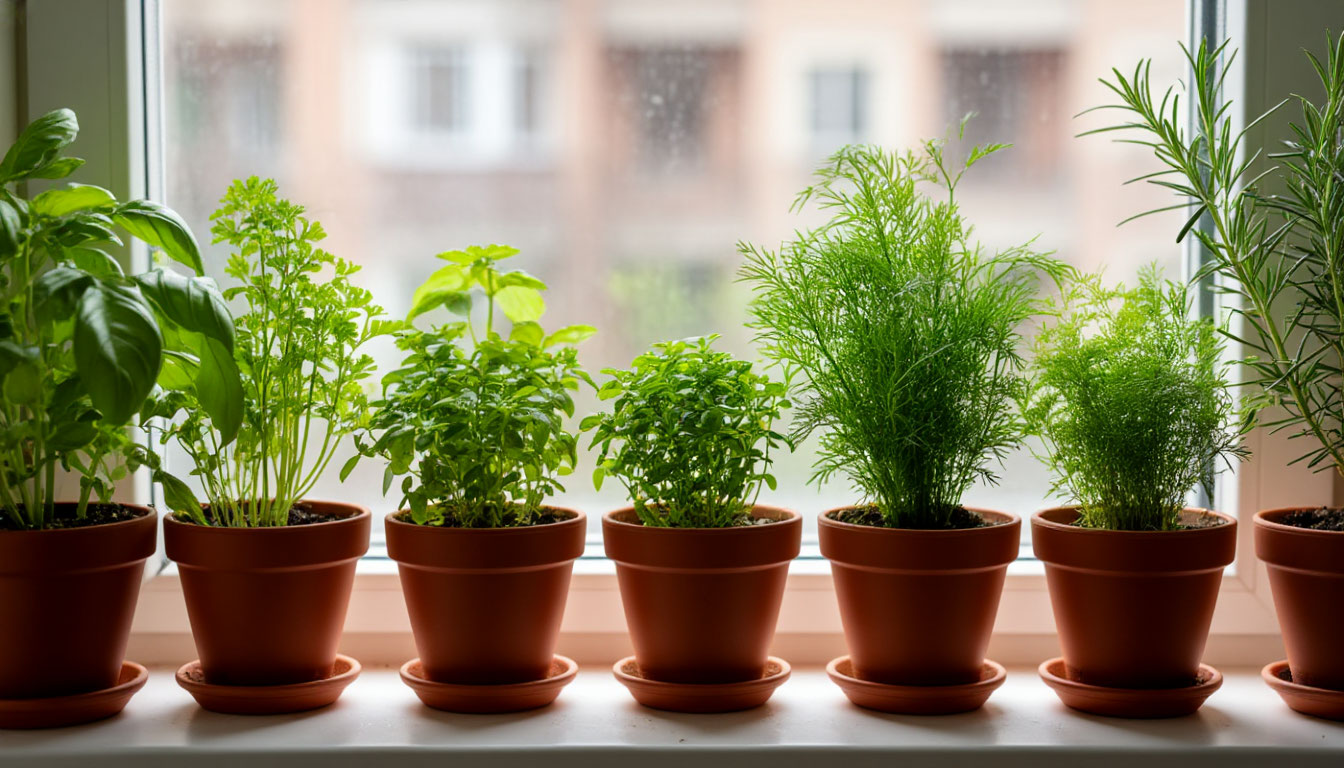 Розмарин. Карликовые сорта вроде «Нежность» отлично живут дома. Ему нужен глубокий горшок с хорошим слоем дренажа на дне (керамзит). Растет медленно, любит рыхлую почву и нечастый, но обильный полив. Зато весной его можно будет высадить на дачу.