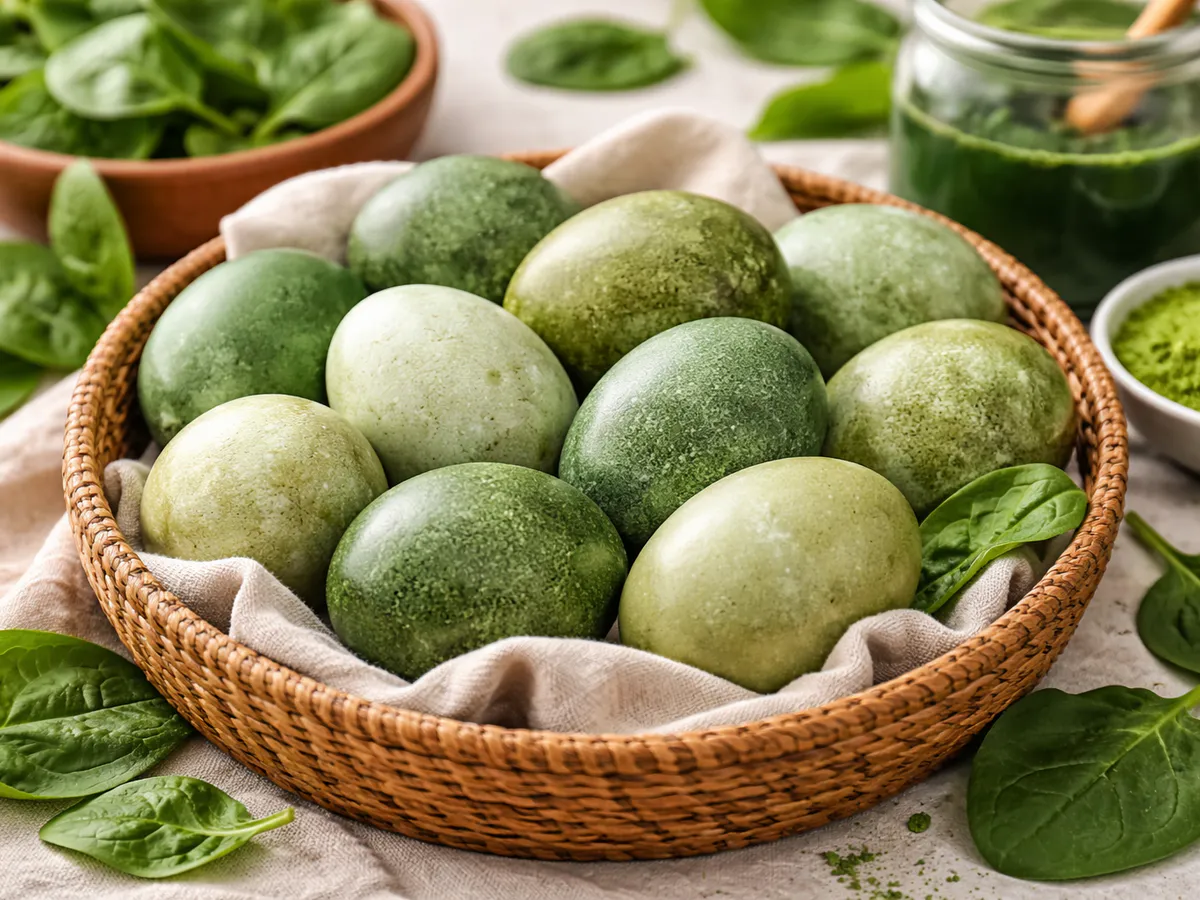 Шпинат даёт самый спокойный вариант — мягкий, будто чуть выгоревший зелёный. Листья варят до насыщенного отвара, потом процеживают. Яйца в такой воде лежат долго, иногда несколько часов. Цвет не кричащий, зато очень «домашний». Добавка уксуса помогает ему не исчезнуть через день.