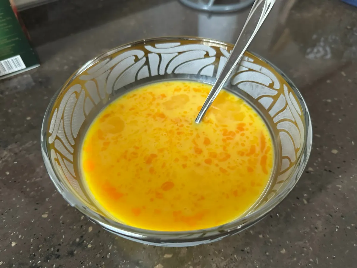 Яичную смесь переливают в стеклянную миску и добавляют небольшой кусочек сливочного масла — он даёт ту самую мягкость, которую сложно описать, но легко узнать.