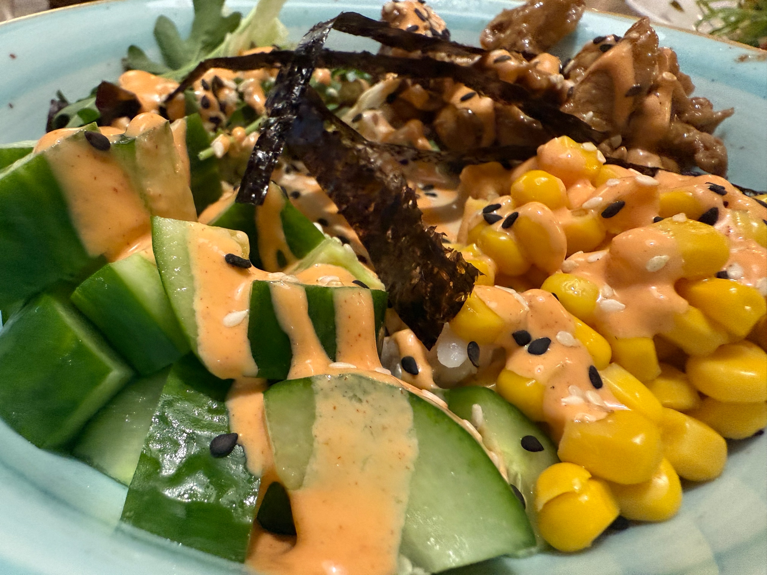 Заправка — ещё проще: пара ложек хорошей сметаны и половинка чайной ложки острой горчицы, не более. Горчица здесь — ключевой элемент, она не даёт салату быть пресным, добавляет пикантности, которая связывает вкусы воедино.