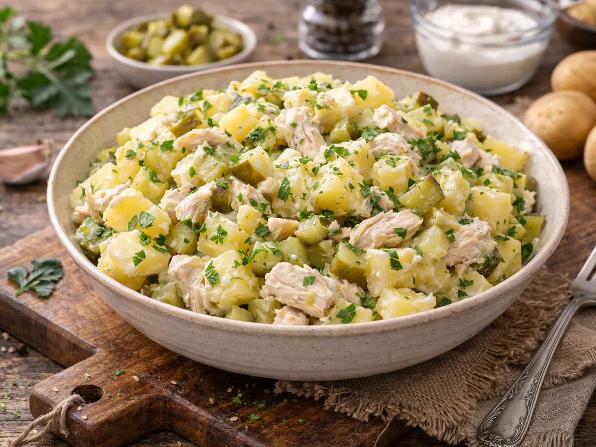Иногда хочется поставить на стол не «что-то лёгкое», а по-настоящему сытную закуску. Такую, чтобы гости сначала попробовали из вежливости, а потом молча потянулись за добавкой. Этот салат как раз из таких. С виду — почти классика. По вкусу — совсем другая история.