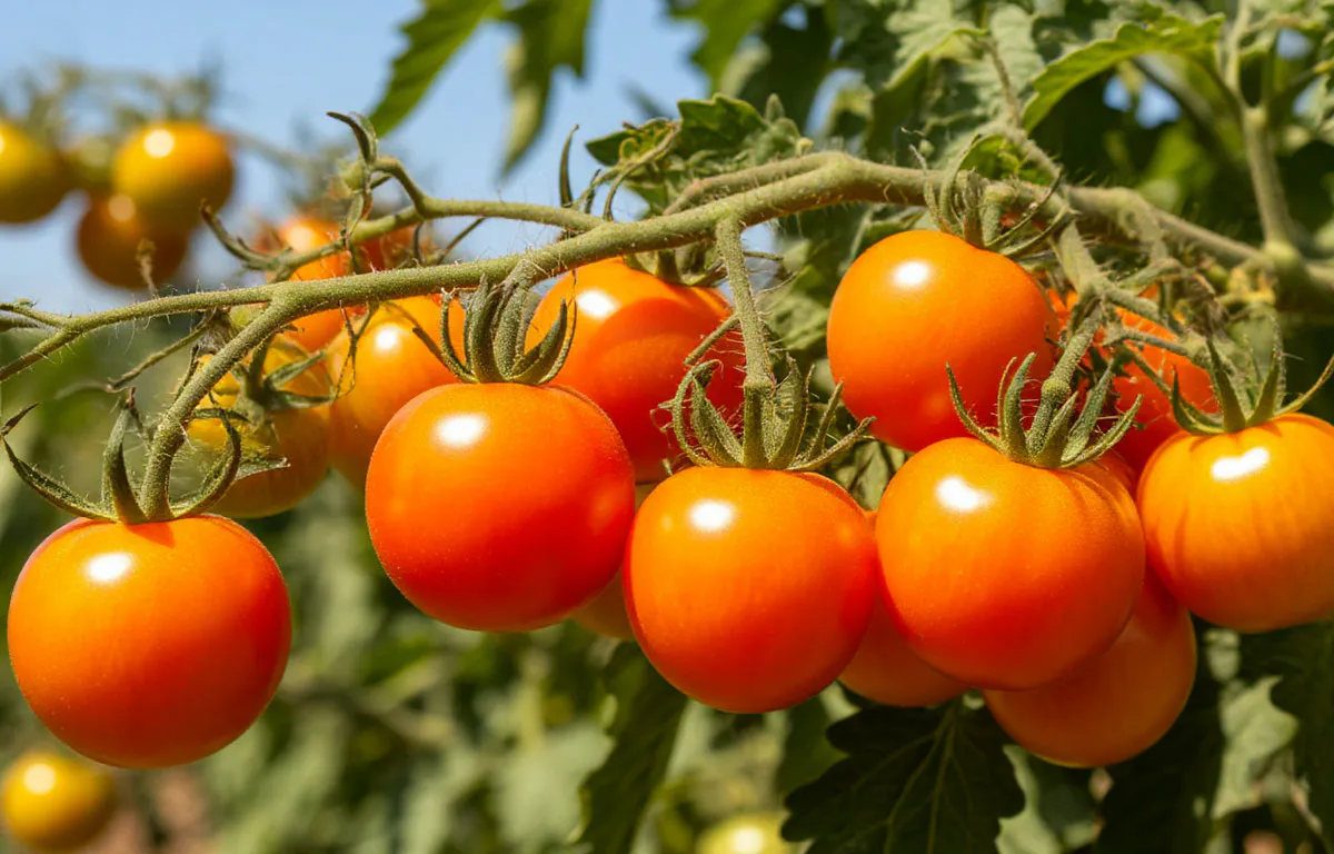 Ещё один «звёздный» сорт — «Сердце Марши». Тёмно-оранжево-красные плоды в форме сердца с зелёными полосами выглядят как украшение. Но их истинная ценность внутри: мякоть сладкая, но с лёгкой терпкой ноткой, которая не даёт вкусу стать приторным. Вырастает до двух метров, в кисти по 5-7 помидоров — урожайность радует. Идеален для свежих нарезок, где нужно сочетание сладости и кислоты.