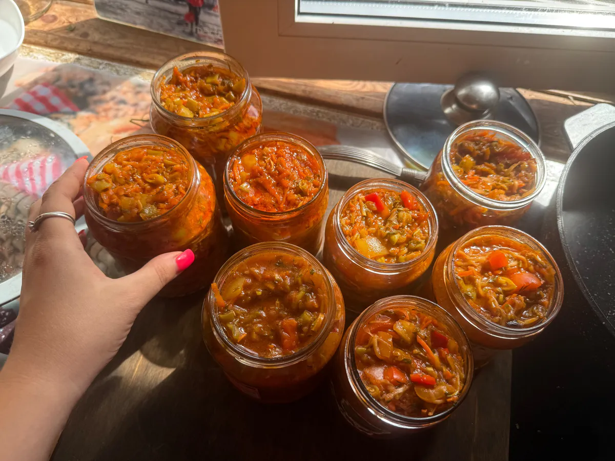 В кипящий томат закладывают подготовленный перец и варят ровно 15 минут. За пару минут до готовности вводят финальные аккорды — измельченный чеснок, лавровый лист и уксус. Уксус в данном случае выступает консервантом, позволяя обойтись без дополнительной стерилизации. Горячий продукт сразу разливают по стерильным банкам, закатывают и укутывают до полного остывания. Банки отлично хранятся при комнатной температуре. Выход — это не только вкусно, но и экономично: из указанного количества получается около 2 литров готового продукта.