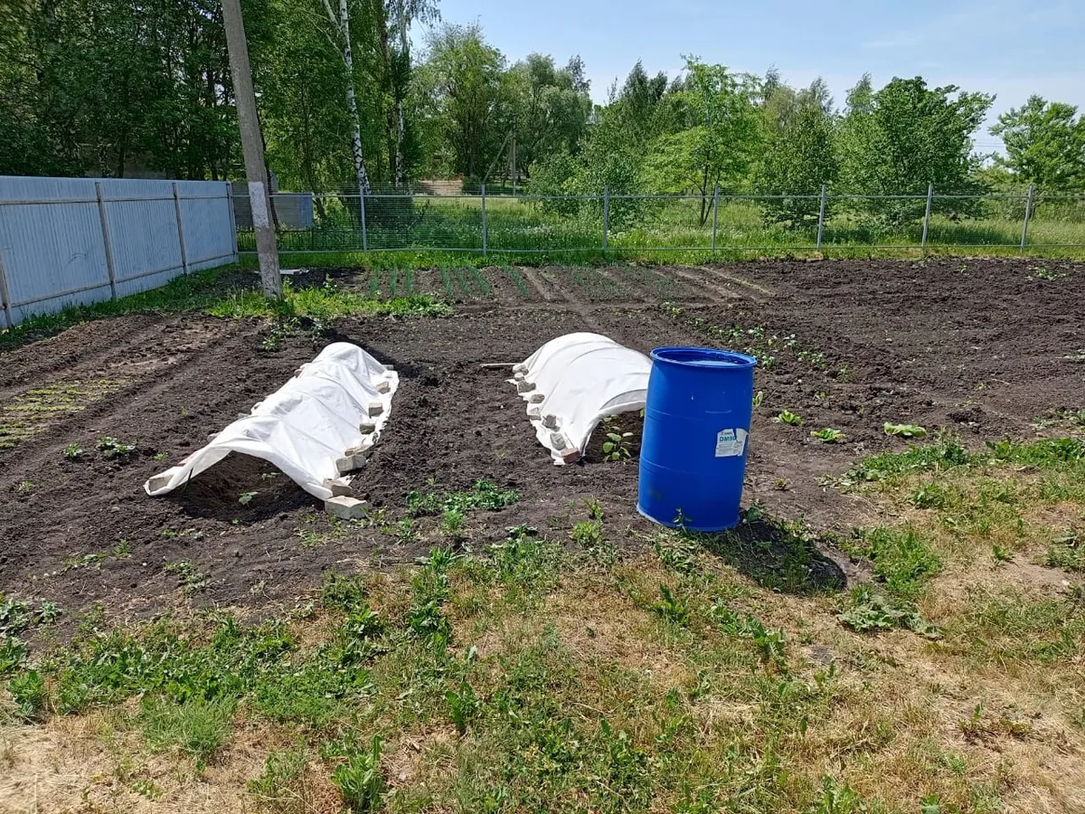 Теперь берём агроволокно и отрезаем кусок по размеру отрезанной части бочки. Главное, внимание! Материал должен немного торчать снизу. Оставьте такой фартучек сантиметров на 10–15.