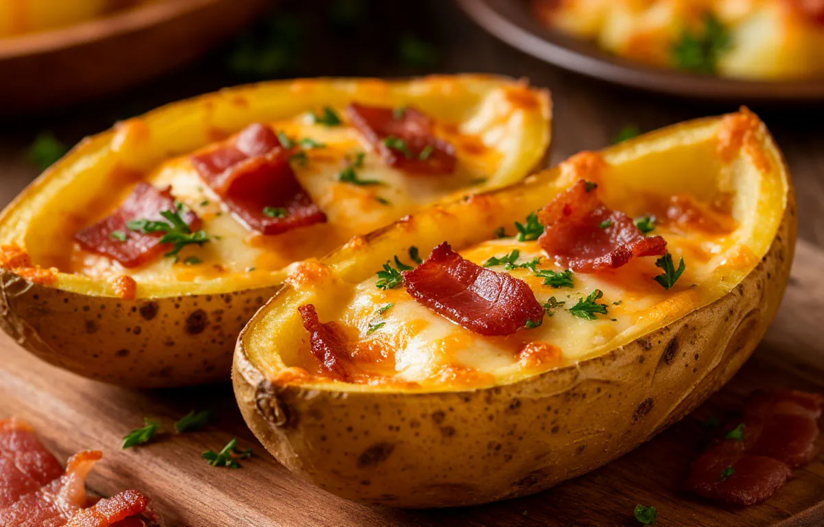 Картошка-лодочка с беконом и сыром хороша тем, что одинаково уместна на будничном столе и в праздничном меню. Можно приготовить всё заранее: запечь картофель, сделать начинку, а в нужный момент собрать и отправить в духовку. Пятнадцать минут — и на столе блюдо, которое выглядит достойно ресторана, а на деле стоит меньше, чем пара чашек кофе.