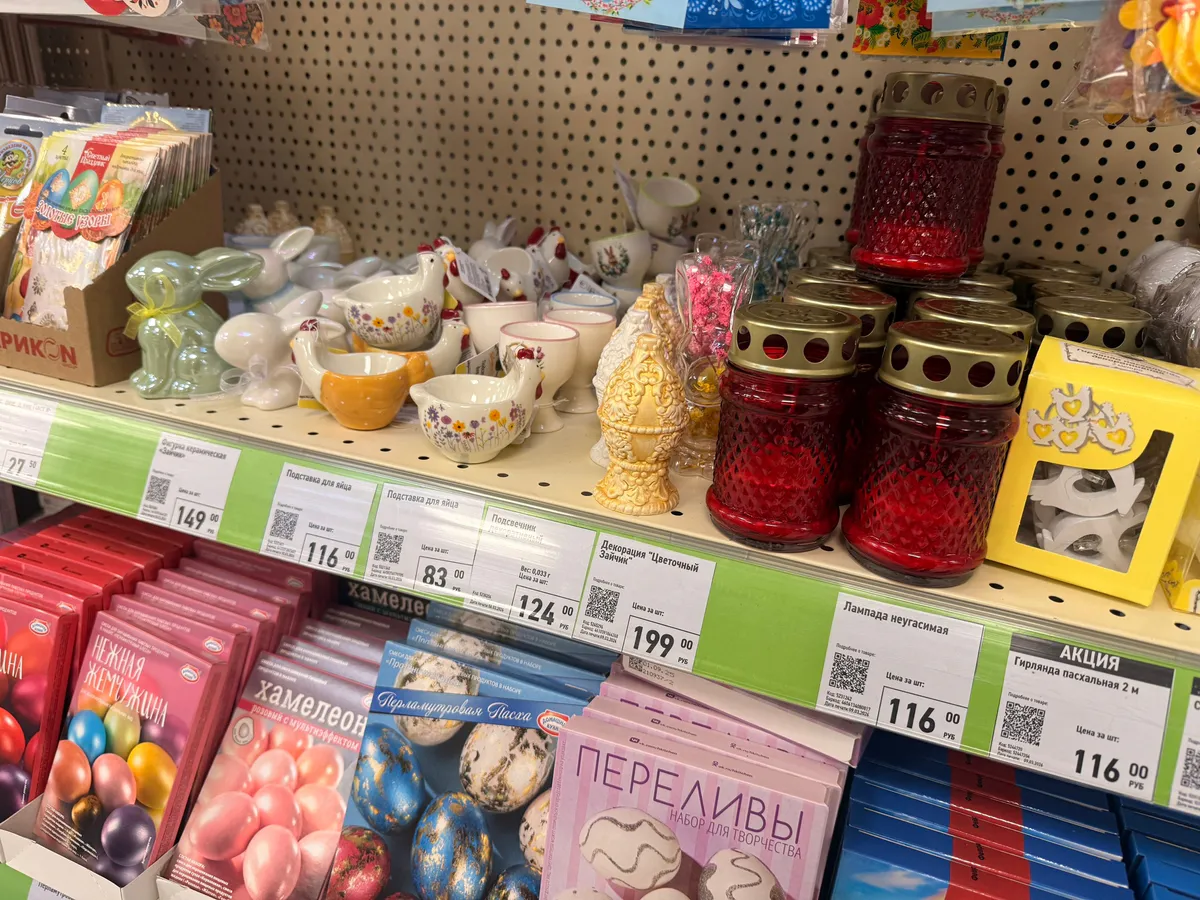 К Пасхе уже начали появляться тематические вещи. Например, тарелка с курочкой для шести яиц — керамическая, стоит около 350 рублей.