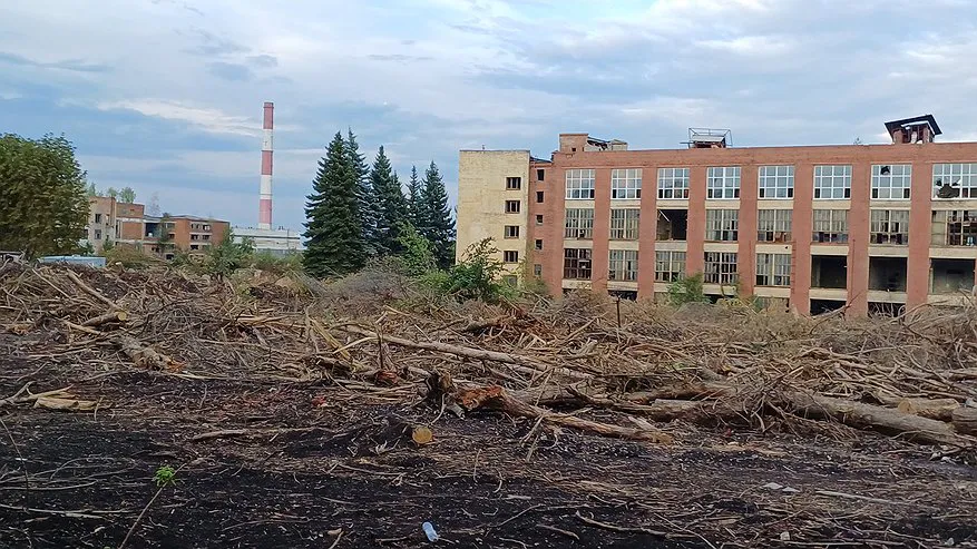 На территории бывшего завода имени Фрунзе, что находился в Заводском районе, началась зачистка площадей. Об этом нам рассказал местный житель Дементий Кошелев, прогуливавшийся по району.