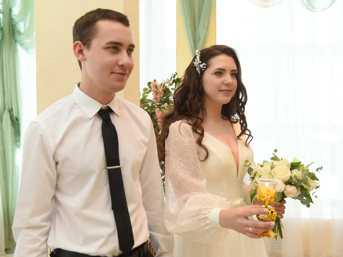 Наталья Еремина, врио заместитель министра труда, соцзащиты и демографии Пензенской области, а также куратор работы органов ЗАГС, передала молодоженам Петру и Наталье Рязановым огонь Семейного очага "Сердце России".