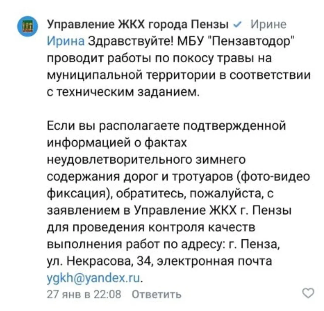 Однако пиком этой истории стало то, что официальная страница Управления ЖКХ Пензы в социальной сети «ВКонтакте» ответили женщине, что очистить тротуар пока нет возможности, так как все сотрудники заняты покосом травы. Женщина сделала скрин переписки и выложила в телеграм-канал «Черный список/Пенза»