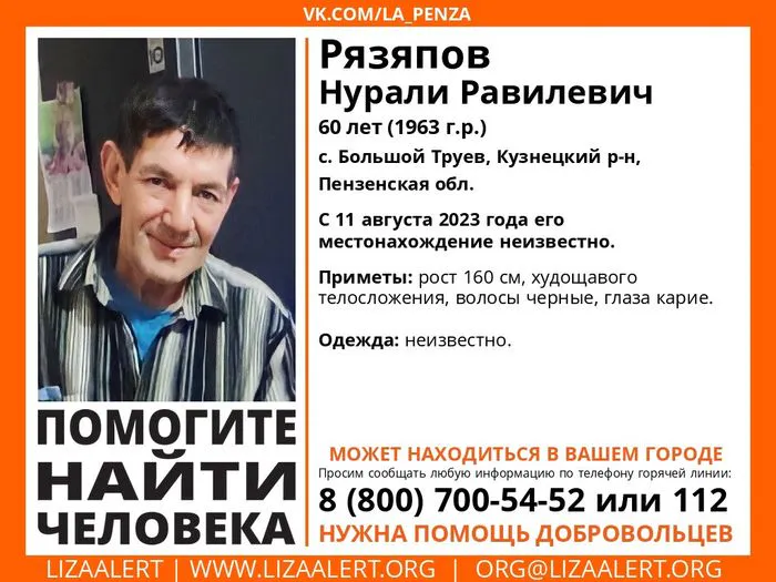 О местонахождении жителя села Большой Труев Нурали Рязапова неизвестно с 11 августа 2023 года. Волонтеры поискового отряда «Лиза Алерт» просят содействия в его поисках.