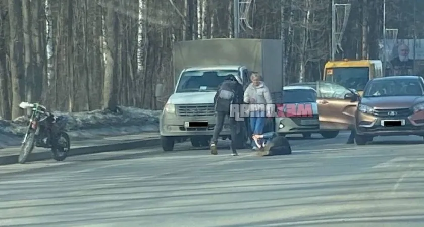 Автор поста утверждает, что примерно в 15:00 легковушка столкнулась с мотоциклистом. На фото видно, что человек лежит на дороге, мотоцикл стоит на обочине, транспорт на месте происшествия остановлен.