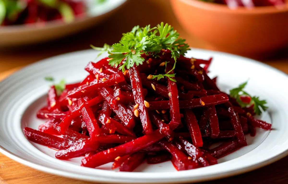 Здесь свёкла раскрывается с неожиданной стороны. Никакой землистой простоты. Она становится звёздной солисткой: сладковатая основа идеально ложится на острые, обжигающие ноты перца и чеснока, а кориандр даёт тот самый фирменный «корейский» аромат. Всё это соединяется под шипящей струёй обжигающего масла, в котором только что золотился лук. Главный бонус – готовится этот всплеск вкуса минут за десять, если, конечно, свёкла под рукой уже отварена.