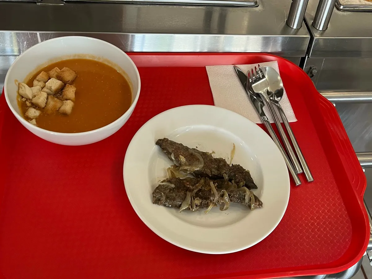 Войдя внутрь, попадаешь в просторный зал с десятком больших, накрытых белыми скатертями столов. Меню? Его нет. Вернее, оно напечатано на скромной бумажке, вложенной в держатель на столе. Ассортимент спартанский: два супа, два салата, пара видов горячего. Никаких изысков, всё как в лучших традициях советской общепитовской классики. Возникает лёгкий скепсис. Но дальше взгляд падает на цены. И мозг отказывается верить, пишет источник.