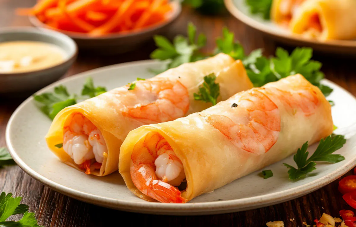 Для начинки традиционно используют свежие овощи, зелень, морепродукты или мясо. Классическая комбинация включает креветки, хрустящий огурец, морковь и сливочный сыр, который связывает компоненты и добавляет нежности. Каждый ингредиент нарезается тонкими брусочками, креветки слегка обжариваются для раскрытия вкуса. Процесс сборки напоминает завертывание конверта: на выложенные компоненты заворачиваются края, а затем вся конструкция скатывается в плотный рулет.