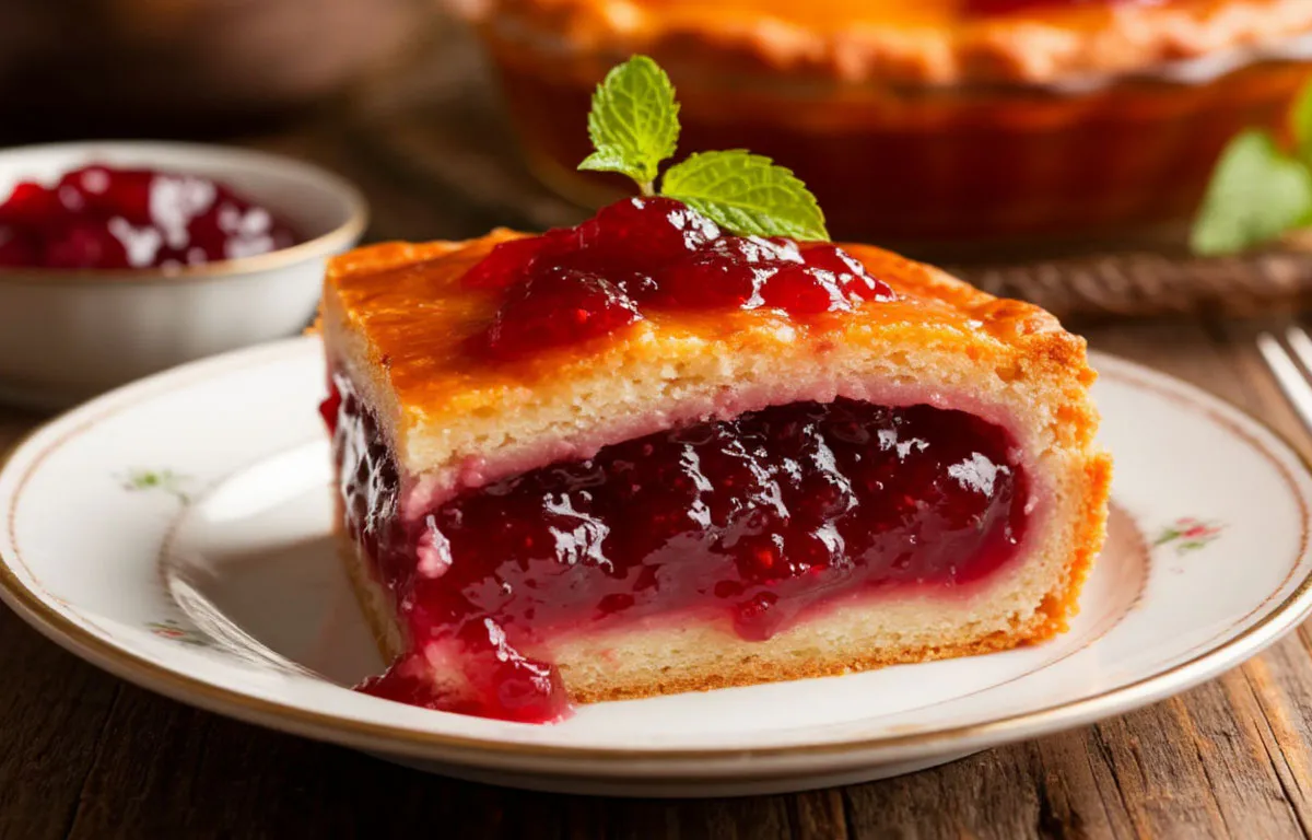 Залить варенье второй половиной теста. Отправить в духовку, выпекать 40 минут при 180°C до золотистой корочки. Дать пирогу остыть в форме — так начинка окончательно зафиксируется. В разрезе видно, как варенье осталось ровно посередине, не опустившись на дно.